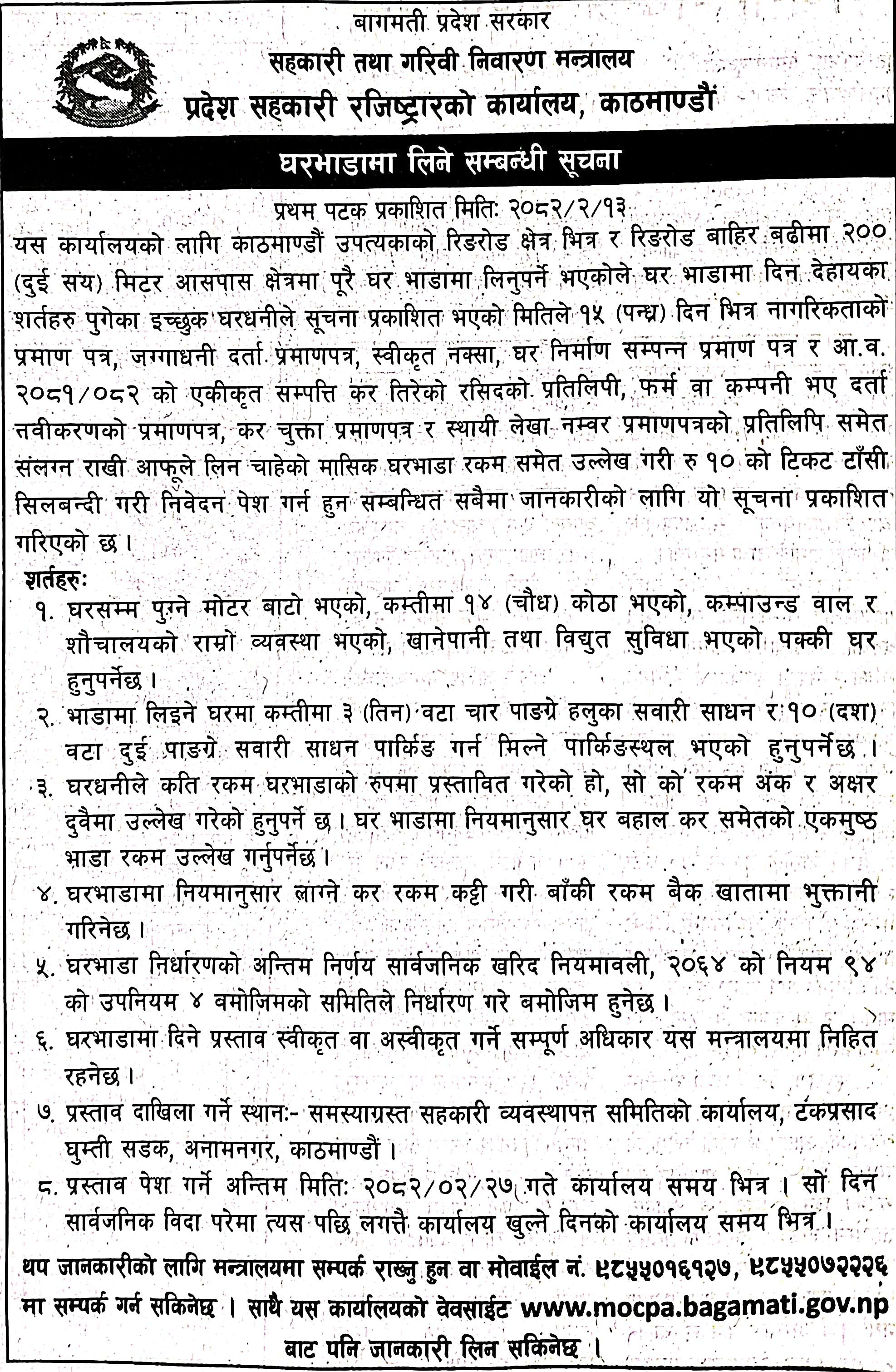 घर भाडामा लिने सम्बन्धी सूचना (प्रथम पटक प्रकाशित २०८२-0२-१३) |